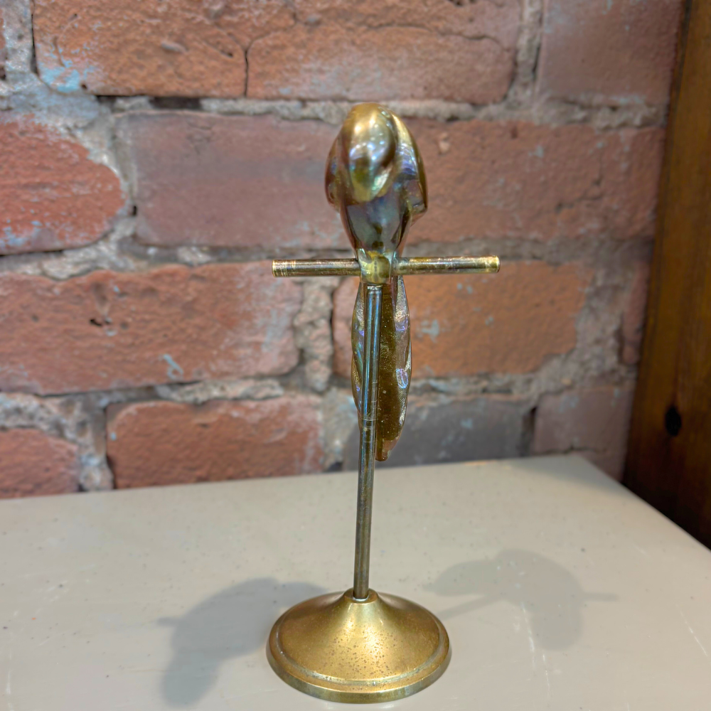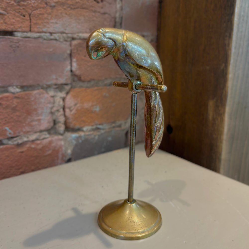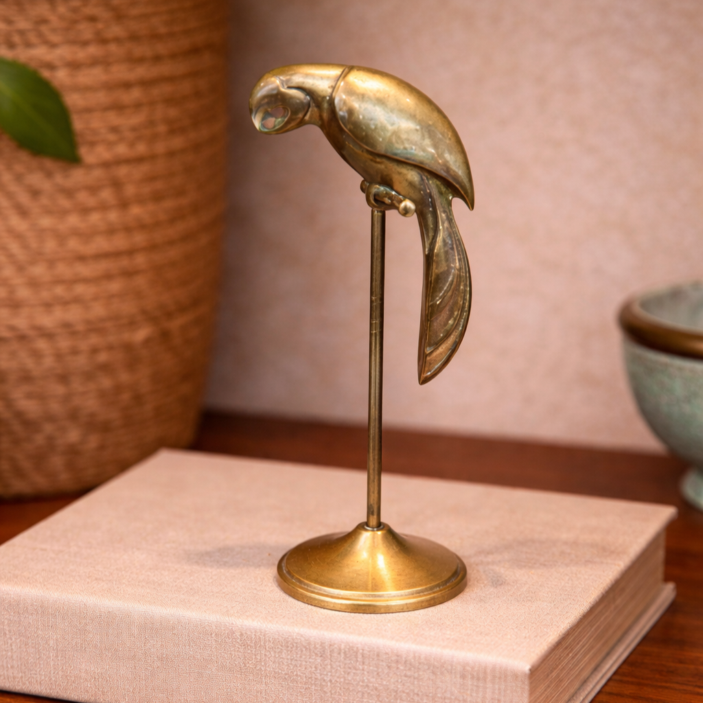 A striking Art Deco-style brass parrot statue with elegant lines and sculptural presence. Made in Korea, this decorative piece captures the bold, stylized form characteristic of the Deco era, making it a distinctive accent for shelf or tabletop display.
