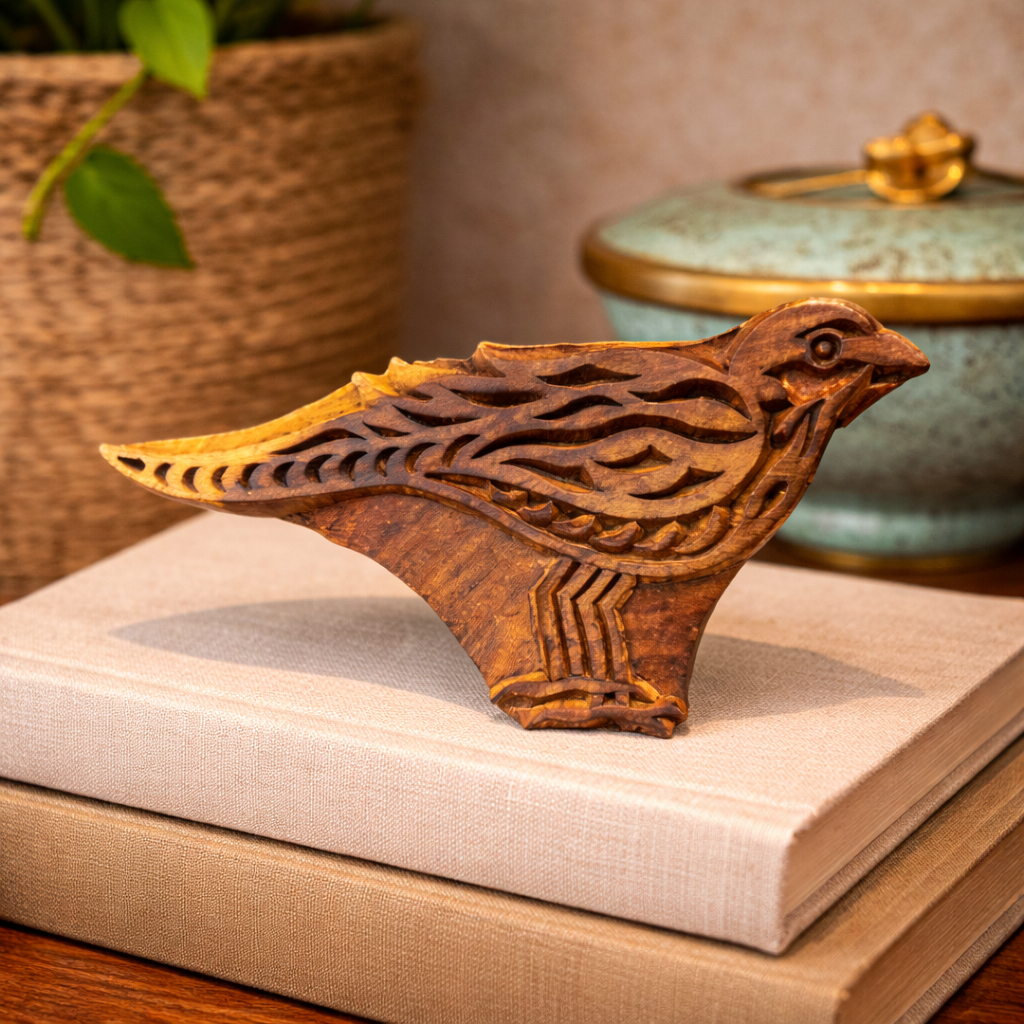 A carved woodblock stamp featuring a bird motif, traditionally used to transfer ink or dye onto paper or fabric to create decorative designs and repeating patterns.