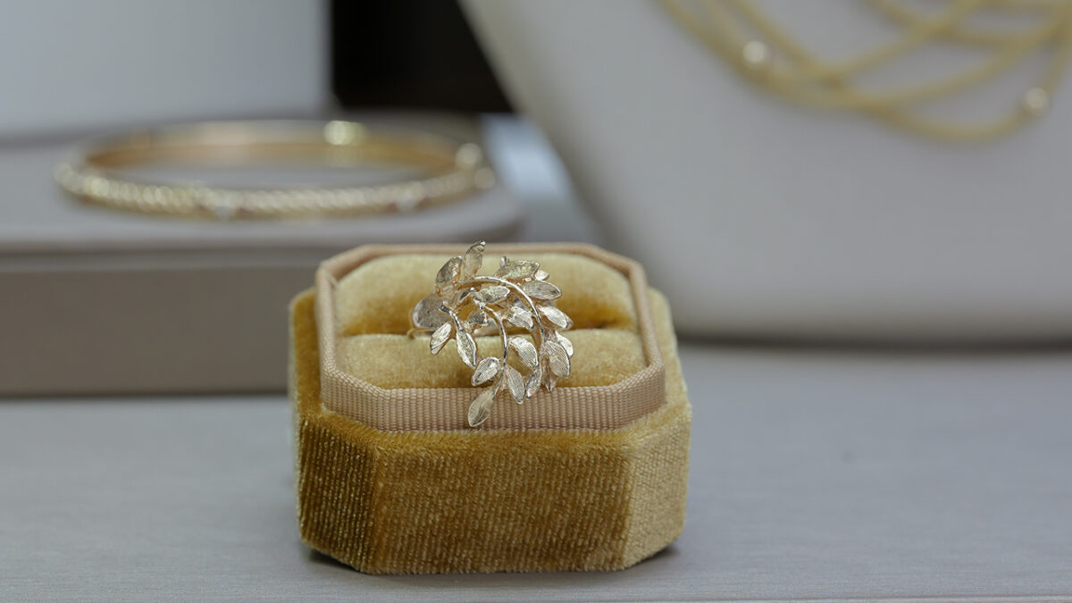 A beautifully sculpted leaf design in rich yellow gold with a soft brushed finish, offering natural texture and elegant style.