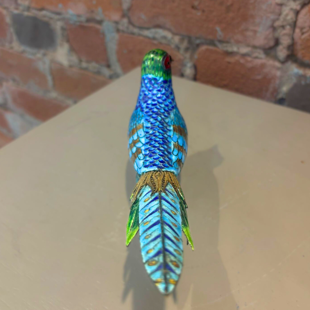 A vibrant Chinese bird figurine crafted in gilt silver with detailed enamel work. Likely modeled as a pheasant, this decorative piece features rich color, layered texture, and an elegant long tail for a striking display.