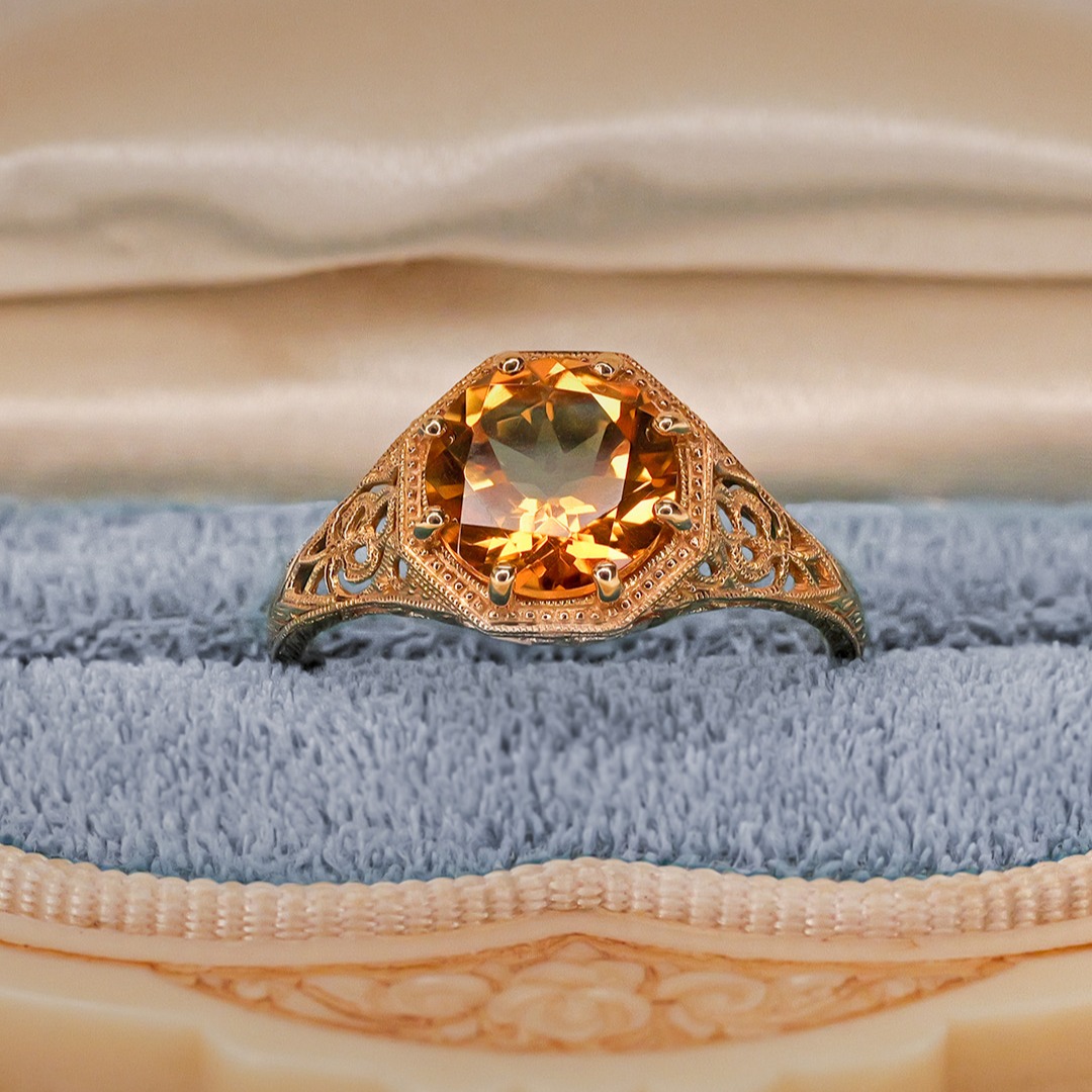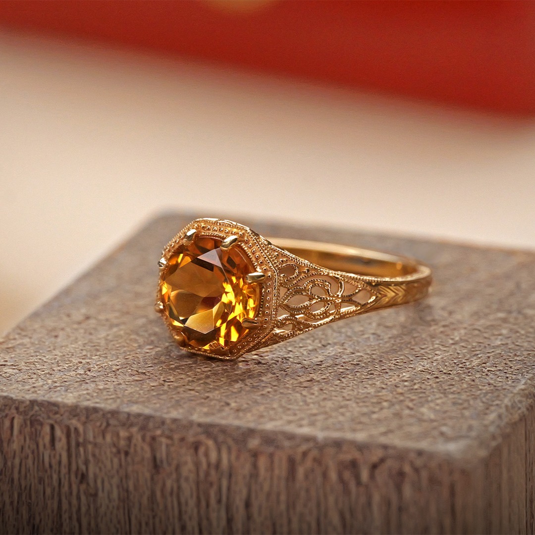 A delicate and refined 14K yellow gold ring featuring a warm-toned citrine set in a milgrain detailed setting. The subtle antique-inspired design and fine edge detailing give this piece a vintage look while maintaining modern craftsmanship.