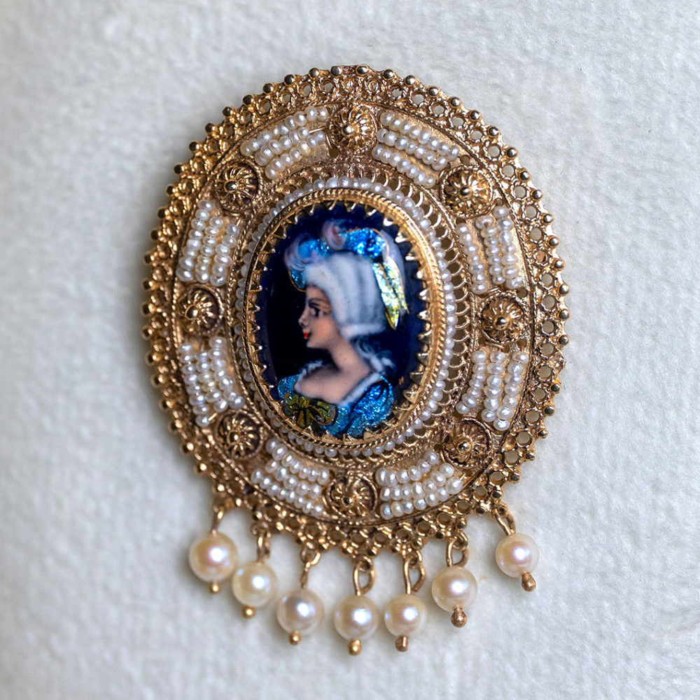 A charming mid-century oval pin/pendant featuring an enamel lady motif with pearl accents, crafted in 14K gold and made in France.