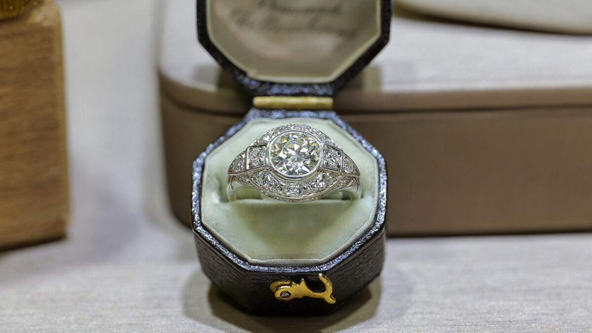 A classic Art Deco–era estate ring featuring a beautifully faceted European cut diamond center, accented by additional diamonds for timeless vintage brilliance.