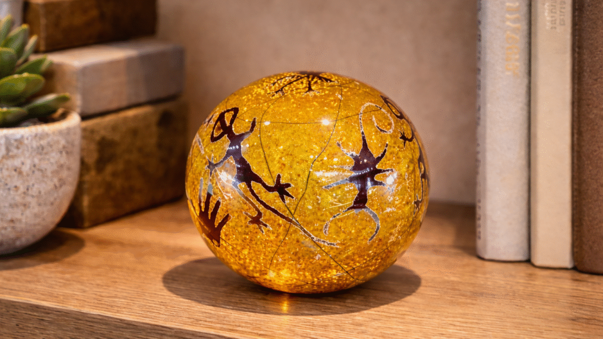A striking hand-made art glass paperweight by local artist Satava, featuring warm golden tones with petroglyph-style gecko imagery. A bold, collectible display piece with beautiful depth and shimmer.