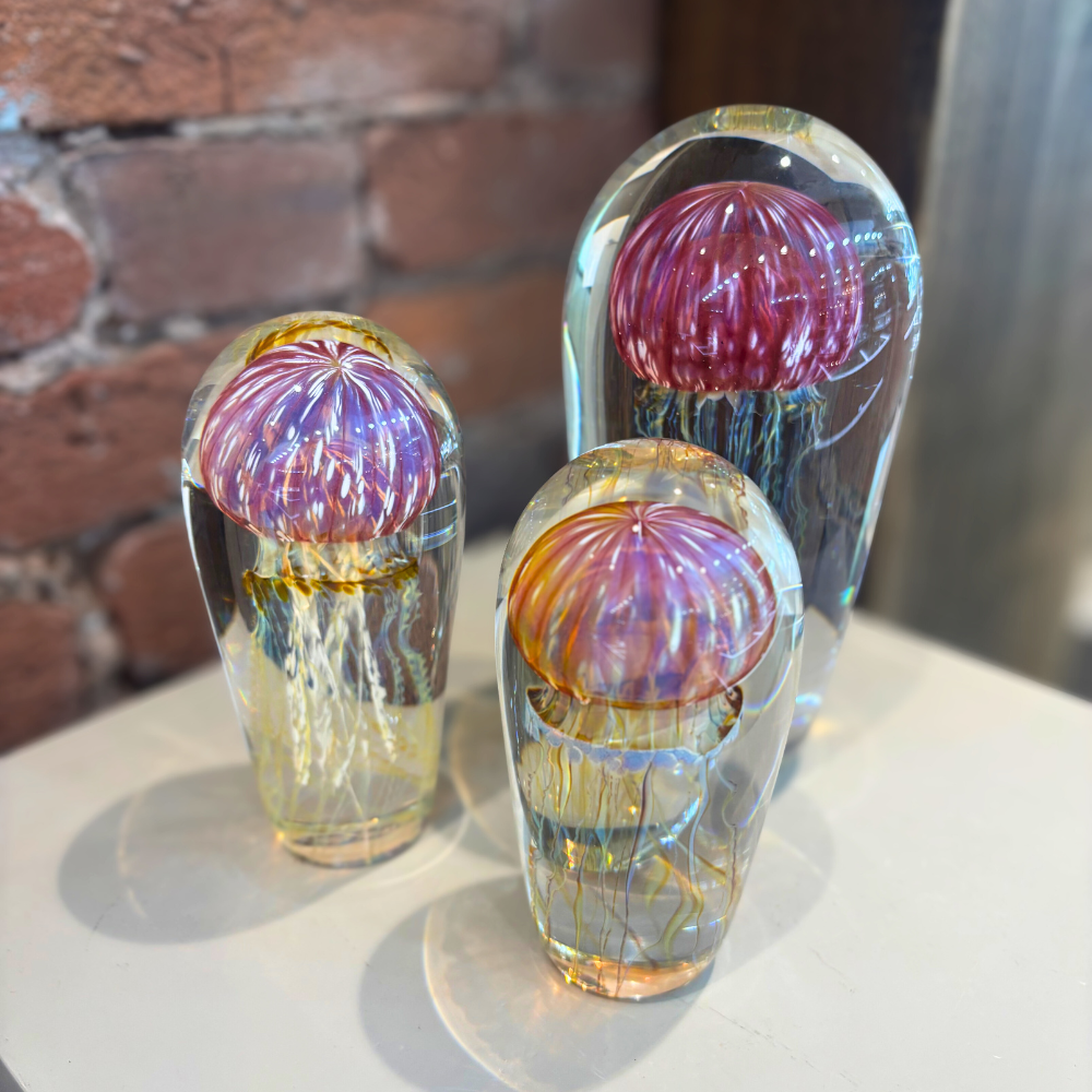 A luminous hand-crafted jellyfish by Satava, showcasing a rich ruby-toned bell floating within clear glass and trailing delicate golden tendrils below. This sculptural piece captures the quiet movement of the ocean, blending depth, light, and fluid form into a striking display object. Each Satava jellyfish is individually made, making every example unique.