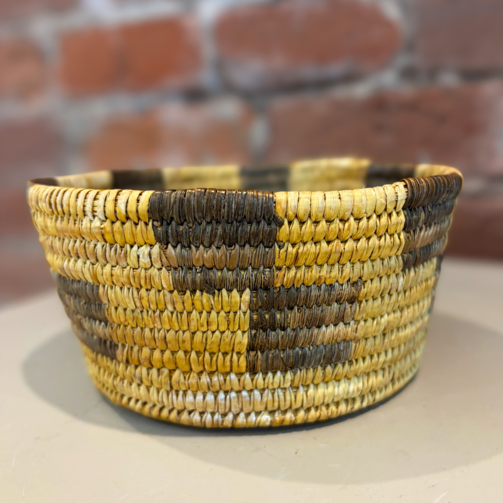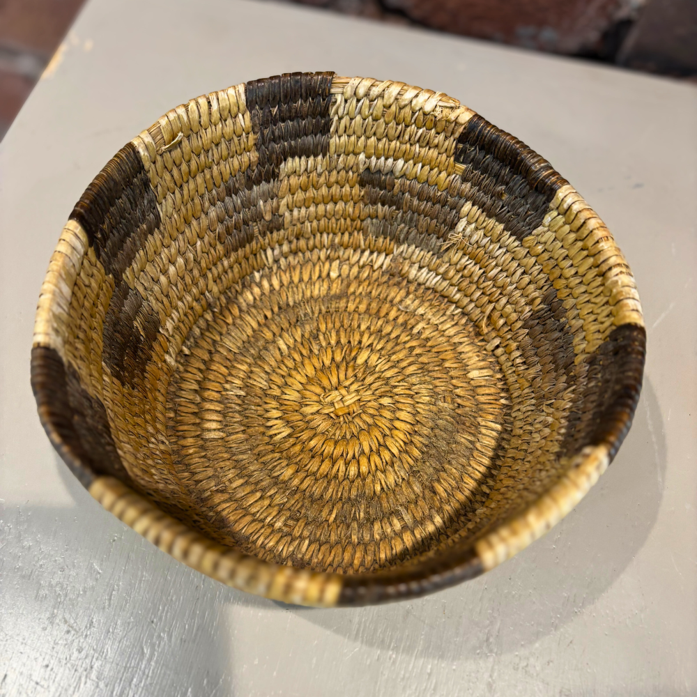 A beautiful Native American woven basket featuring a classic checkered design, showcasing the fine traditional basketry work associated with the Tohono O’odham people.