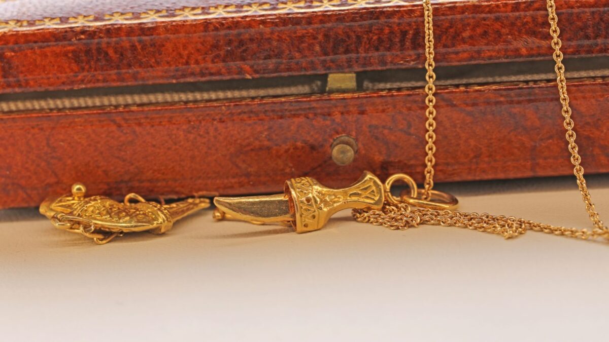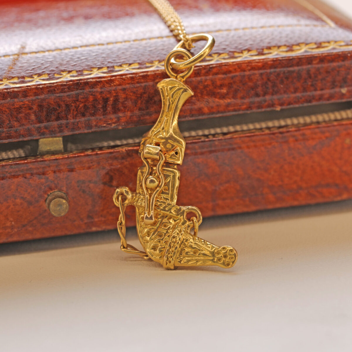 A finely detailed 18K yellow gold sword charm inspired by the traditional Omani Khanjar, a symbol of honor, heritage, and strength. This miniature piece features a sheath with a functional clasp, allowing the sword to be released—adding both craftsmanship and interactive design.
