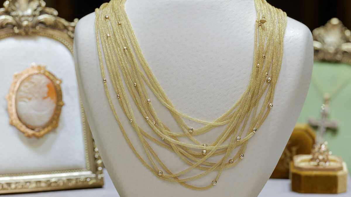 A graceful estate mesh necklace featuring layered strands of rich yellow gold for a soft, fluid drape and timeless appeal.