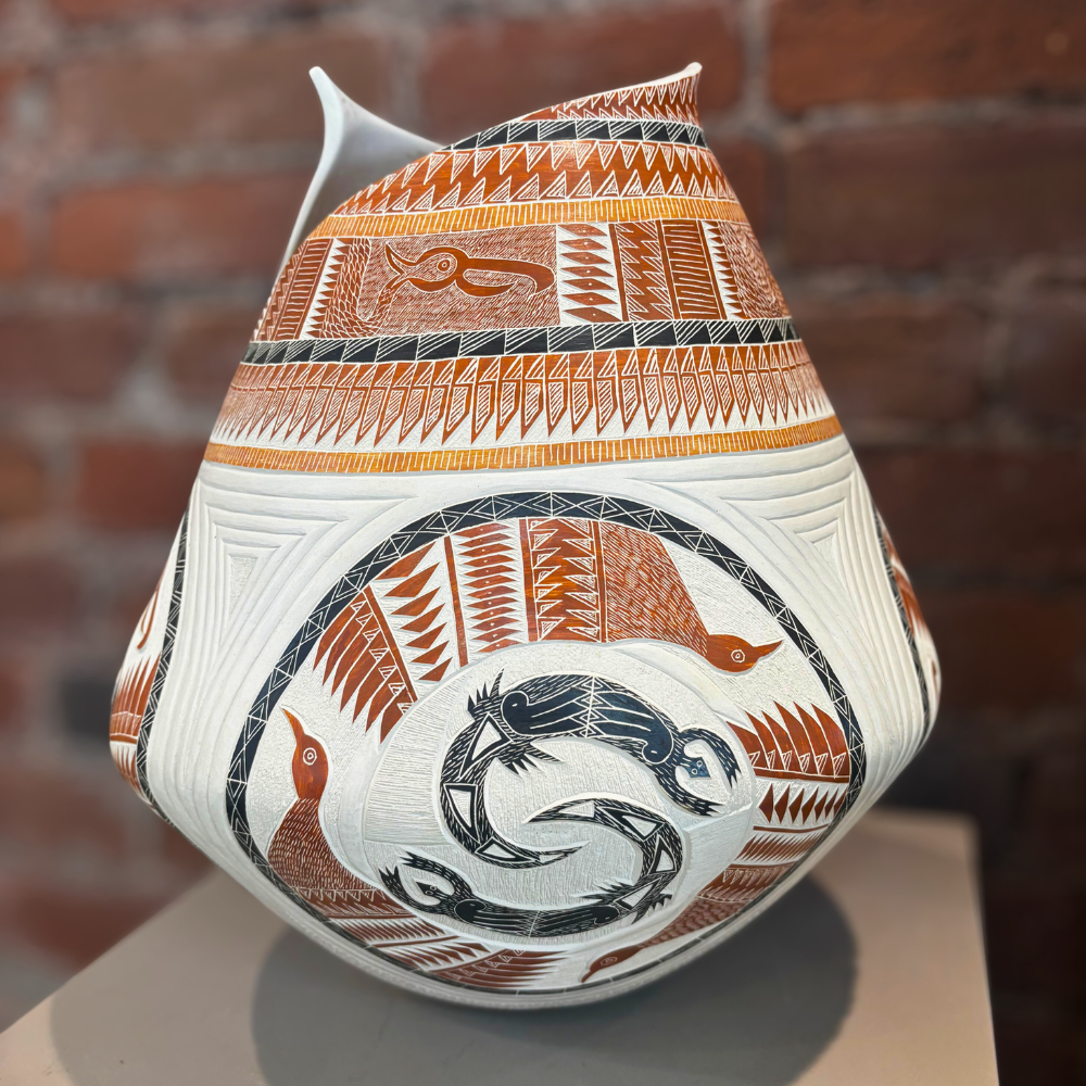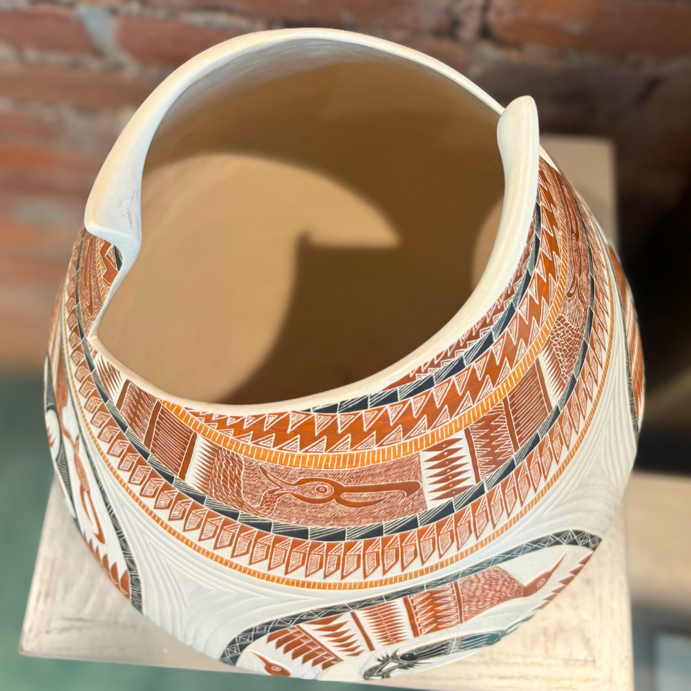 A striking large Mata Ortiz pot featuring painted bird motifs and a pointed opening, signed by artist Eleuterio Pina A. Inspired by the revival of ancient Mogollon and Casas Grandes pottery traditions, this piece reflects the precision, balance, and artistry that define Mata Ortiz ceramics.