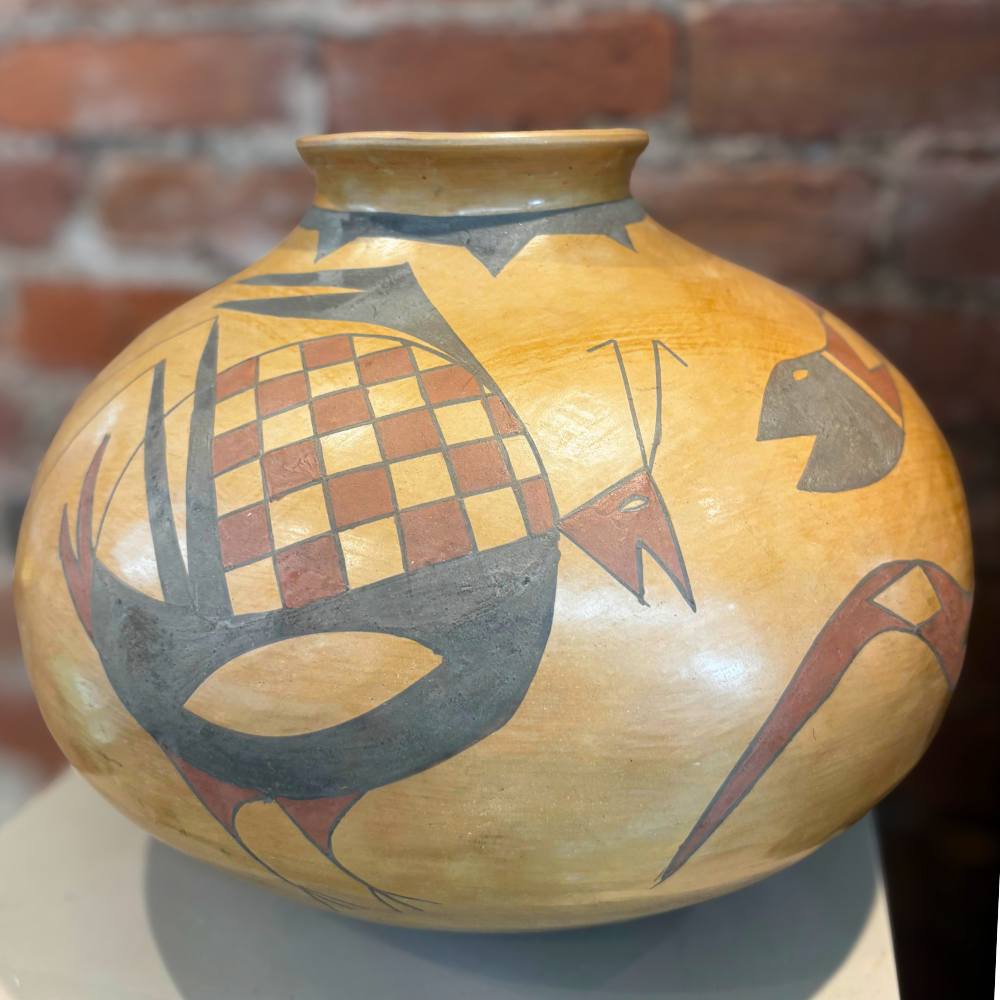 A striking Mata Ortiz jar vessel featuring detailed bird and snake imagery. Part of the celebrated Mata Ortiz tradition—contemporary pottery inspired by ancient Mogollon ceramics found near the Casas Grandes (Paquimé) site in Chihuahua, Mexico—this piece showcases exceptional hand-painted design and craftsmanship, created primarily for display.