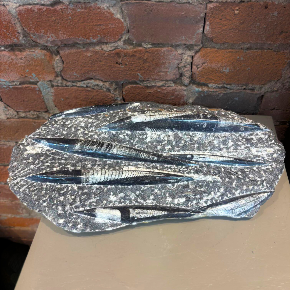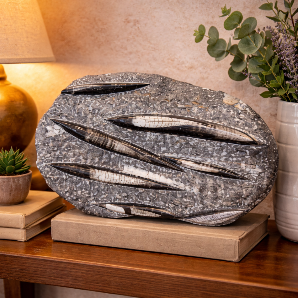 A beautifully polished stone slab featuring embedded Orthoceras fossils. These extinct nautiloid cephalopods—ancient relatives of modern-day squid—are recognized for their distinctive straight, conical shells. This piece highlights the natural geometry and preserved detail of these prehistoric marine creatures, making it a striking natural history display.