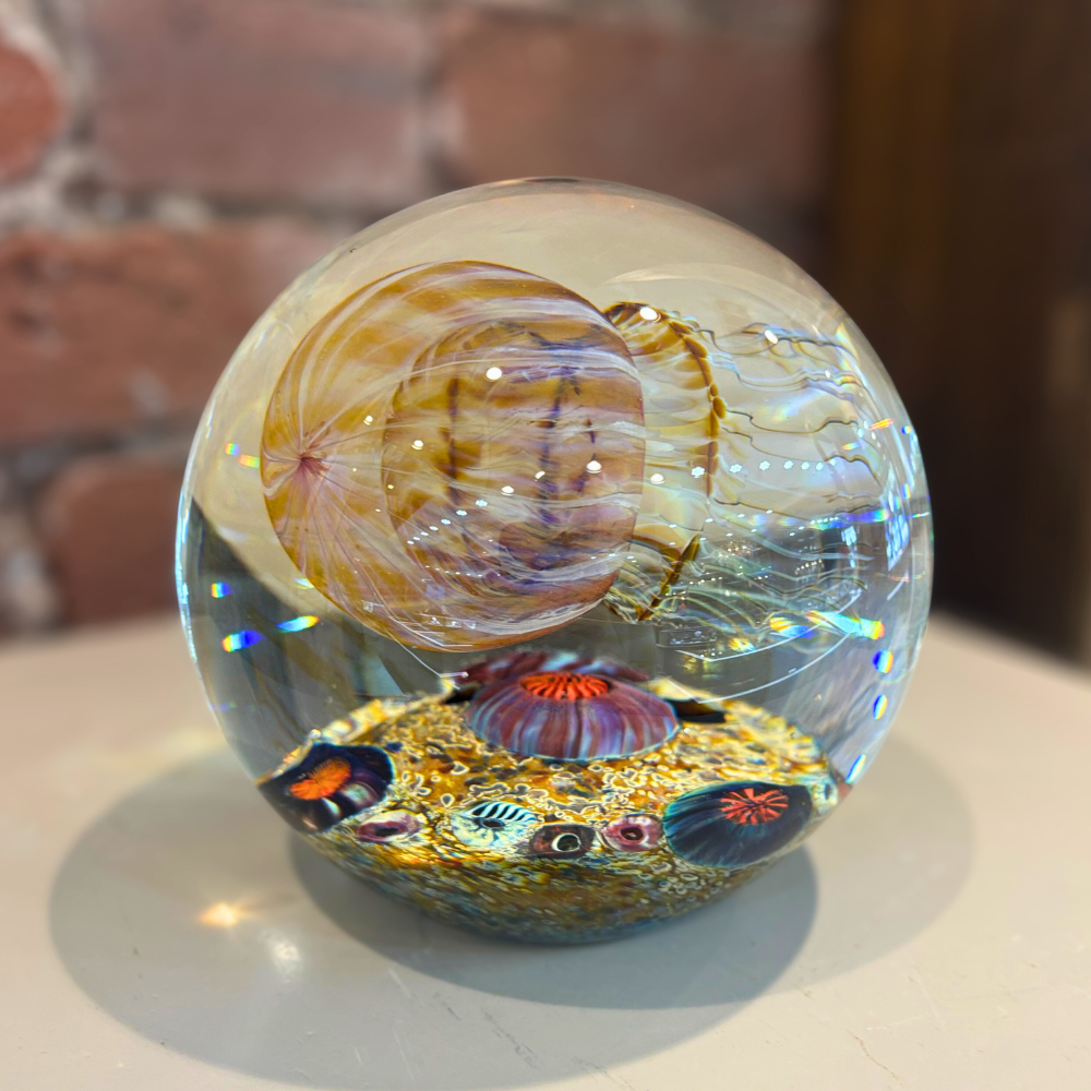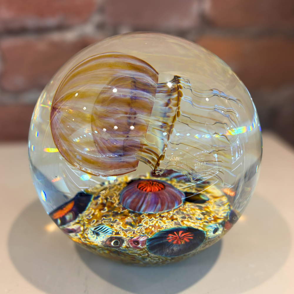 A mesmerizing hand-made art glass piece by local artist Satava, featuring a softly glowing “moon” jellyfish suspended in crystal-clear glass above an ocean-inspired base. A stunning coastal display sculpture with depth, color, and movement.