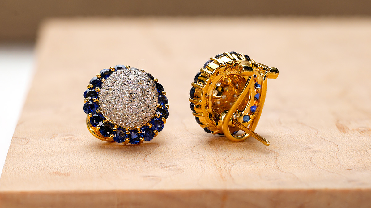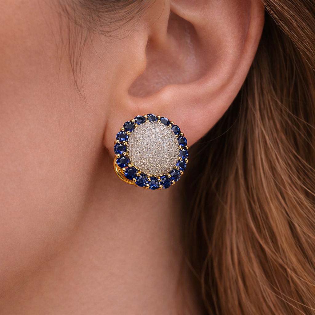 A striking pair in rich 18K yellow gold, featuring a domed pavé diamond center framed by a halo of deep blue sapphires. Bold yet timeless, they offer beautiful sparkle and saturated color in a classic cluster design.