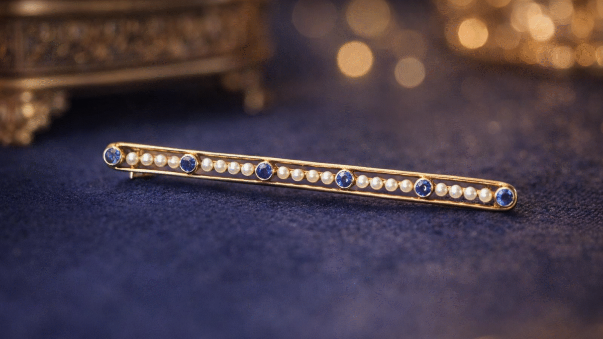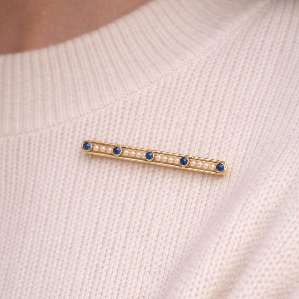 An elegant Edwardian brooch adorned with lustrous pearls and rich blue sapphires, delicately crafted in yellow gold for timeless grace and refinement.