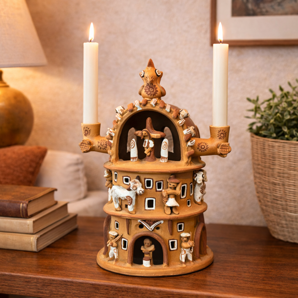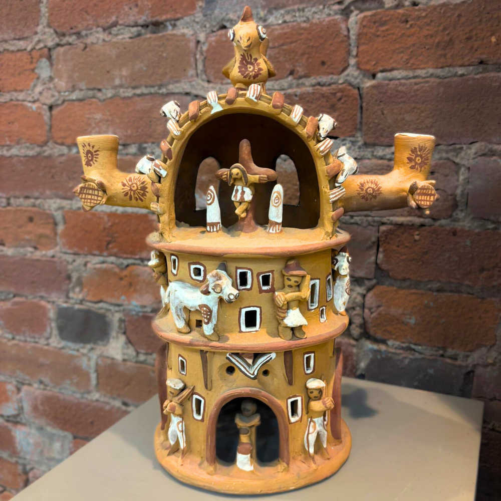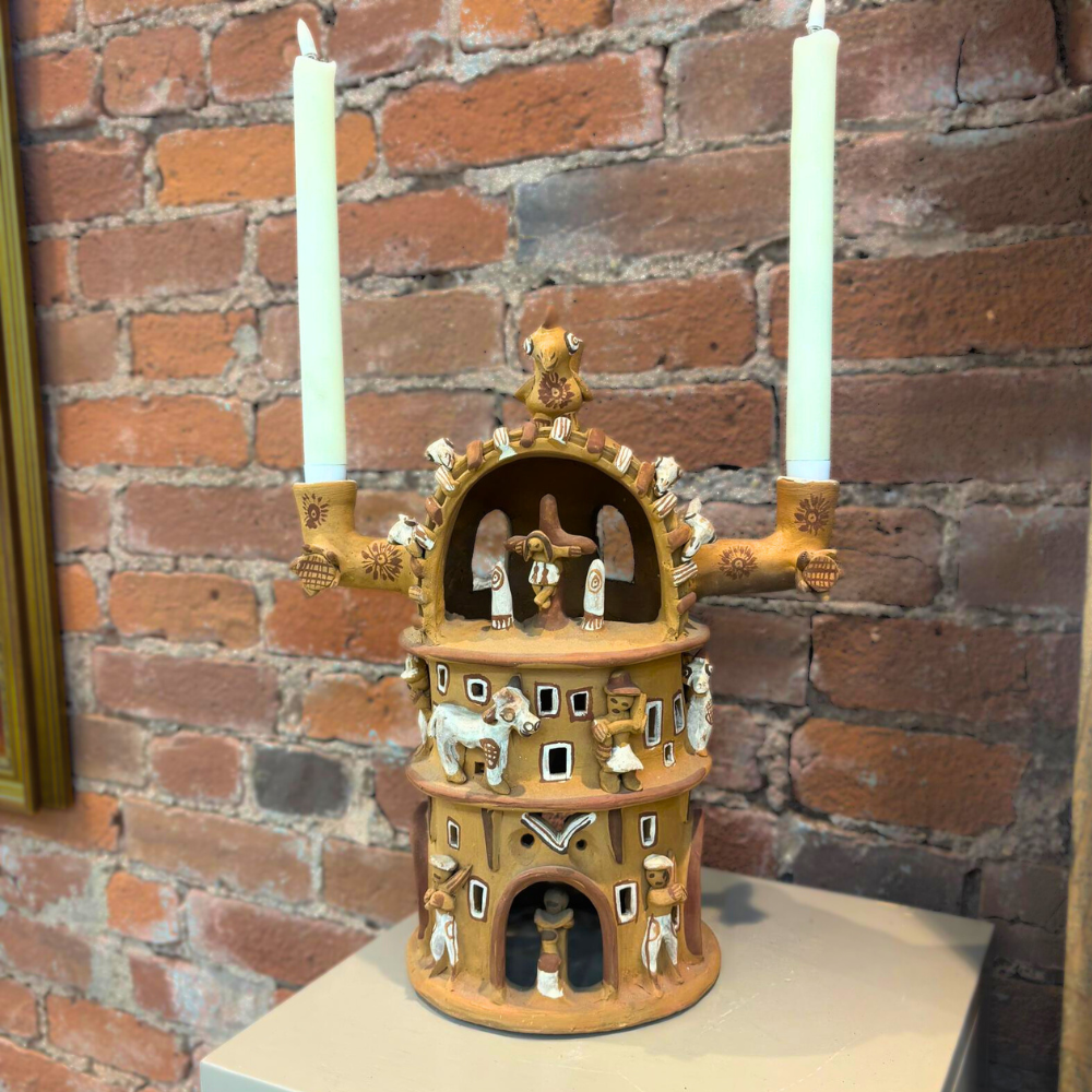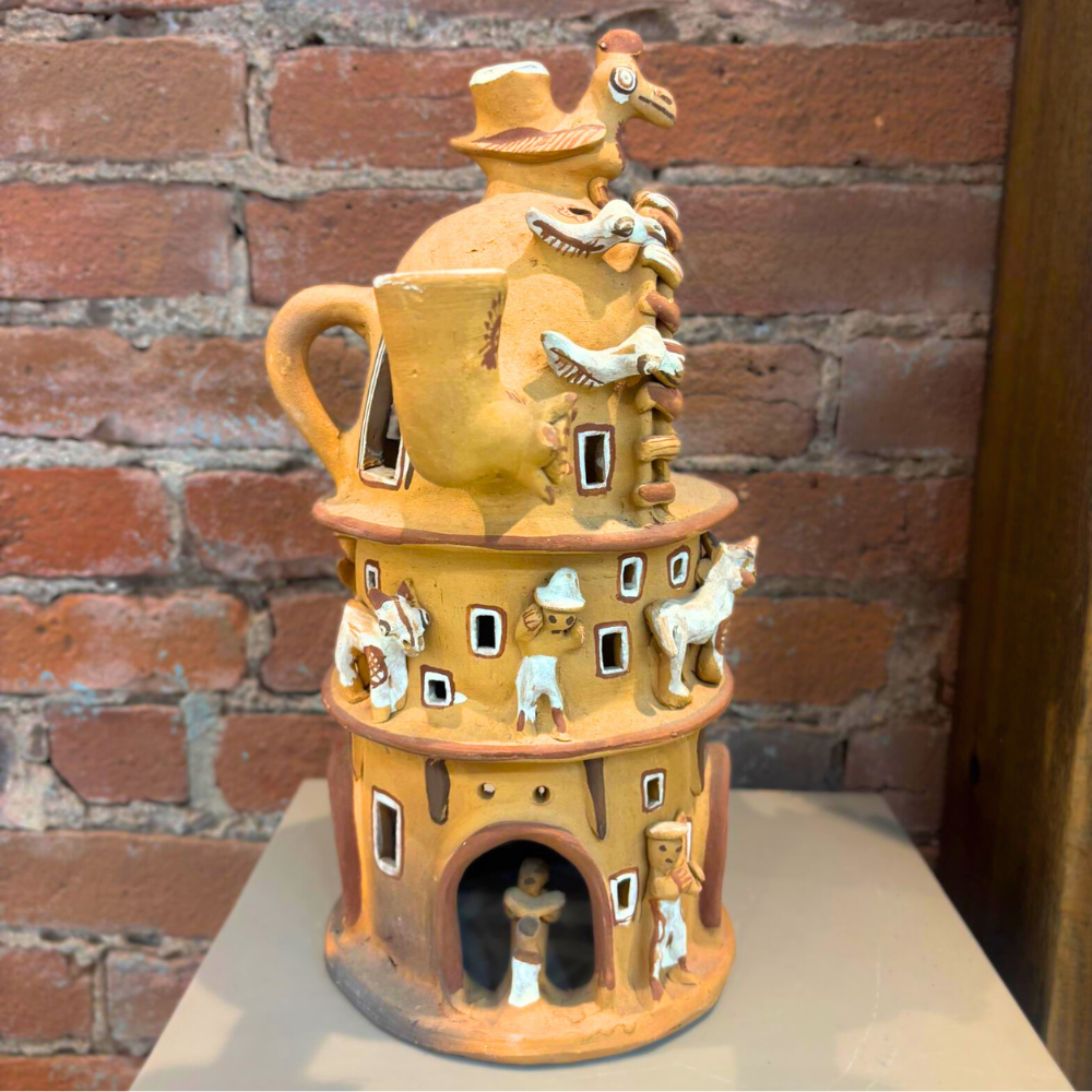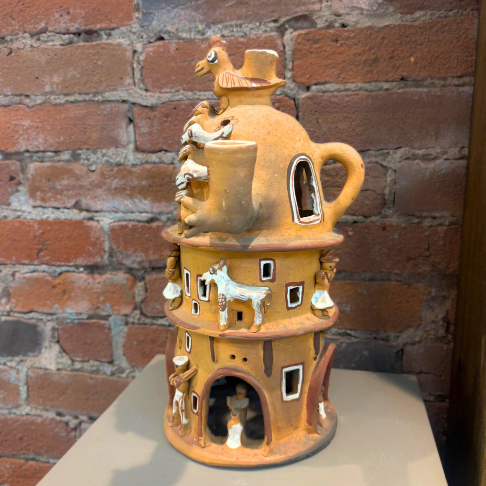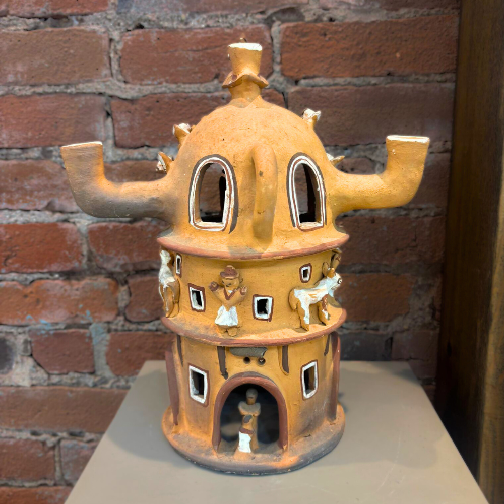 A charming Peruvian folk art candle lamp sculpture, often referred to as a “Casa de Terraza” or Terraced House. Handcrafted in Peru from unglazed terra cotta clay, this architectural form features layered terraces and charming structural details, designed to glow warmly when illuminated by candlelight.