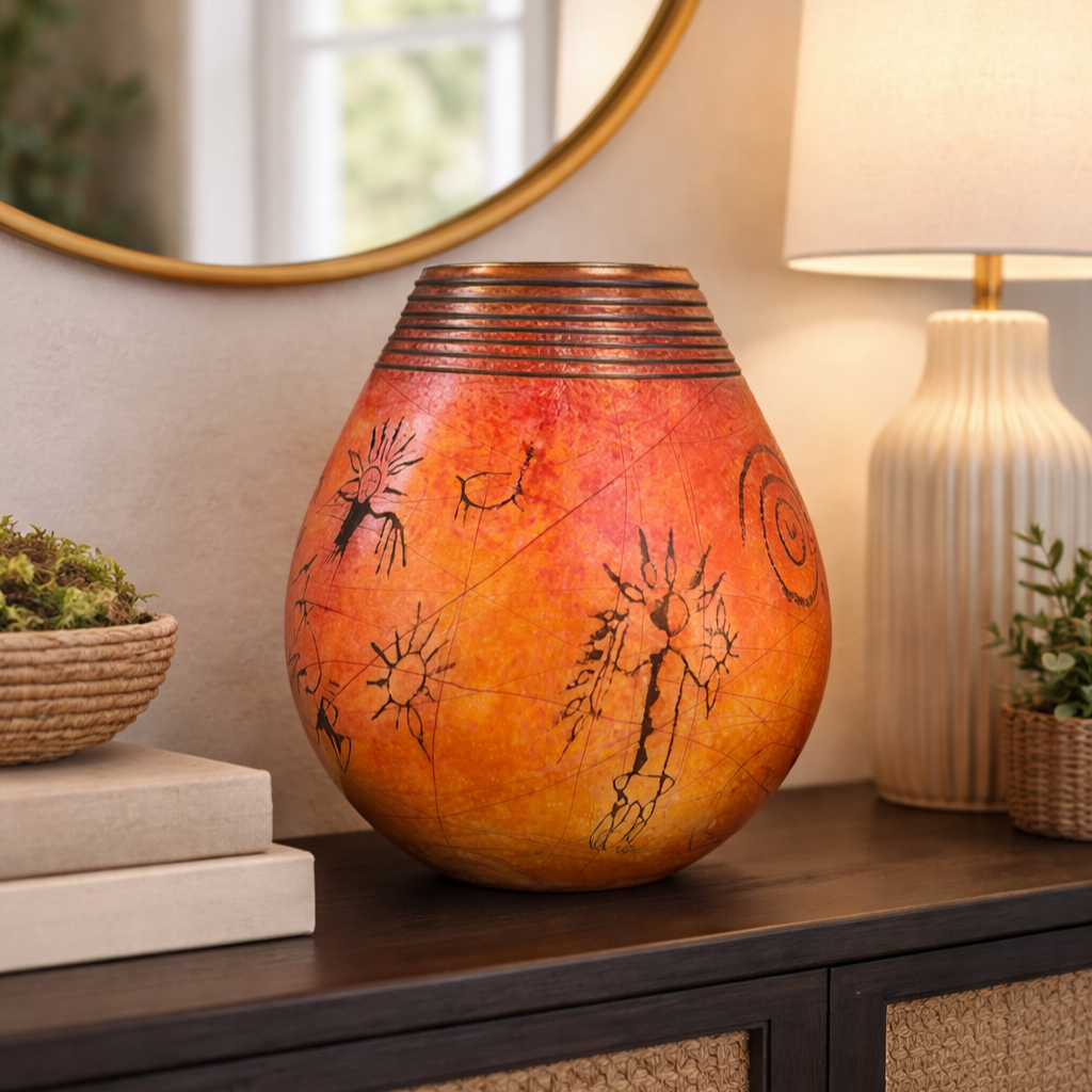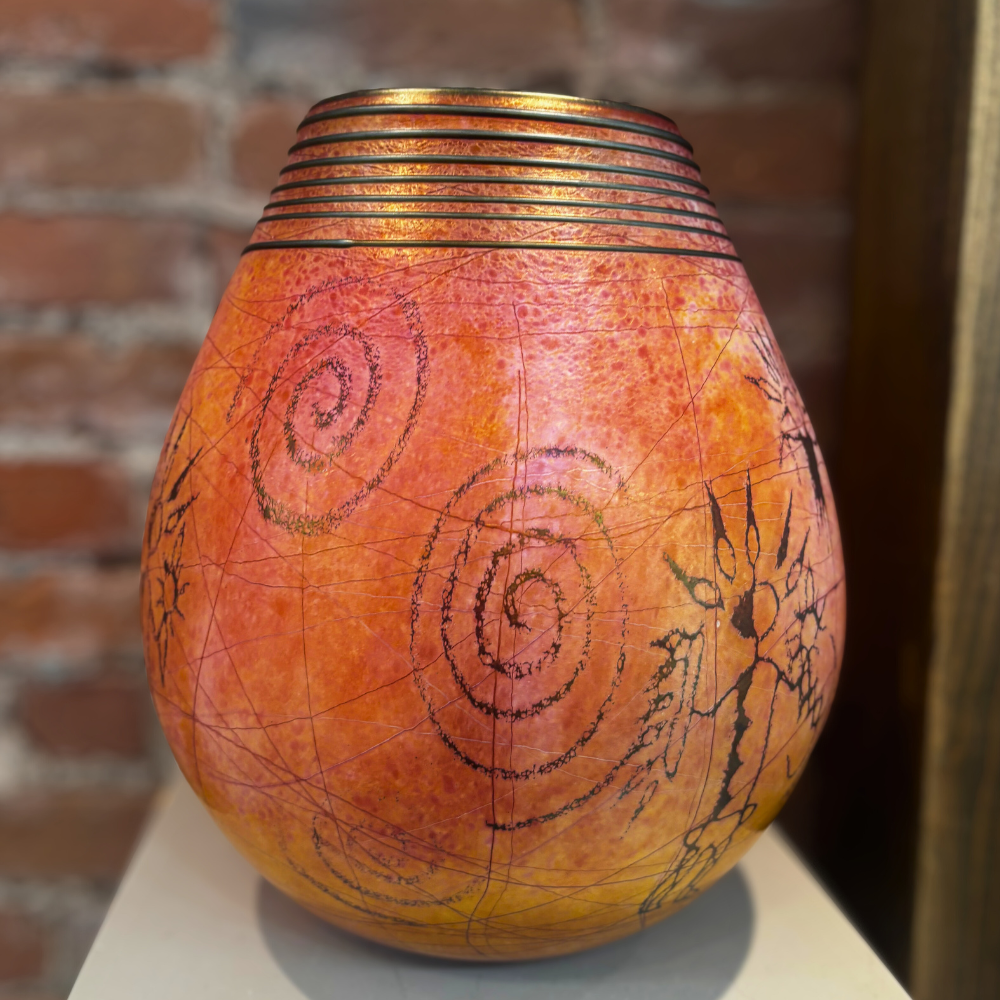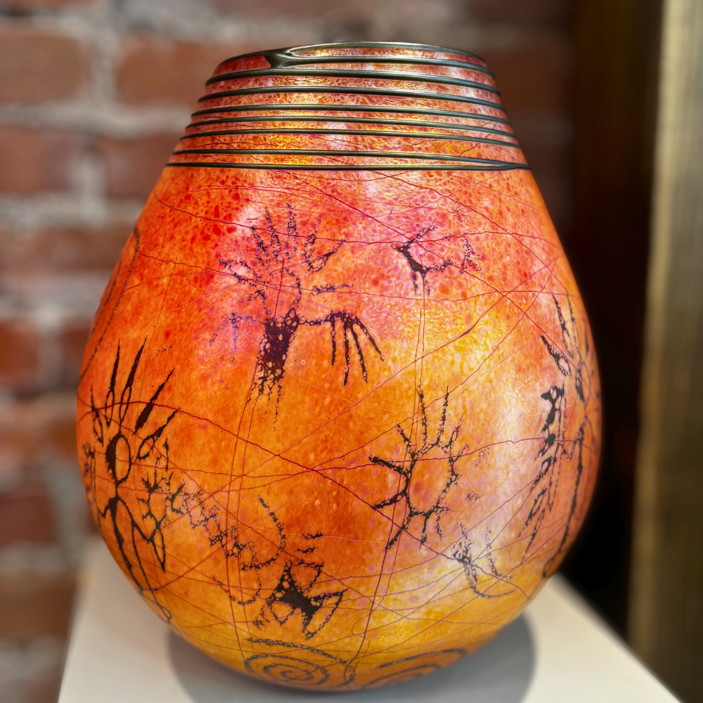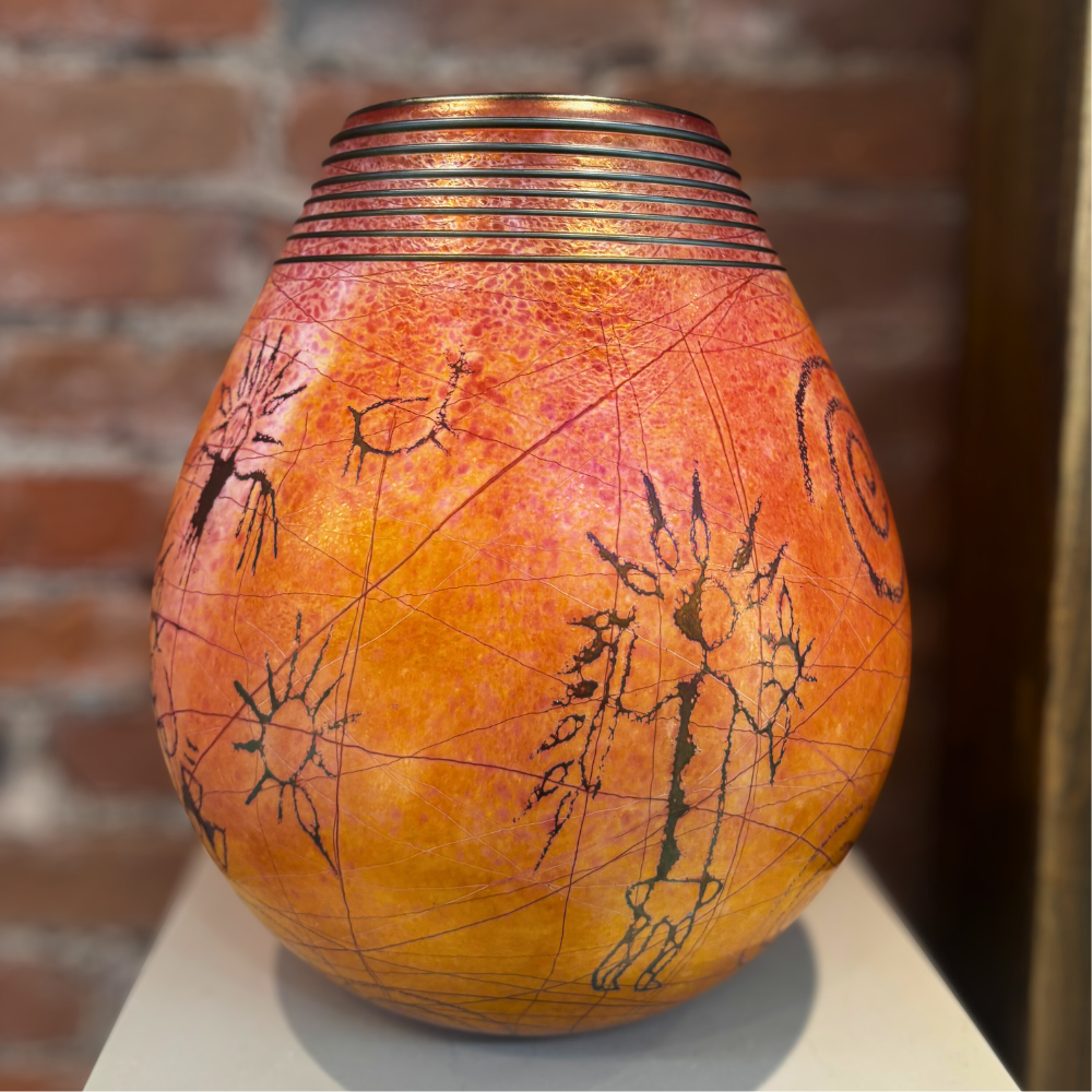 A radiant hand-made art glass basket by local artist Satava, featuring warm golden tones with petroglyph-inspired imagery and layered surface texture. The softly rounded form and sculptural rim make this an eye-catching display piece from every angle.