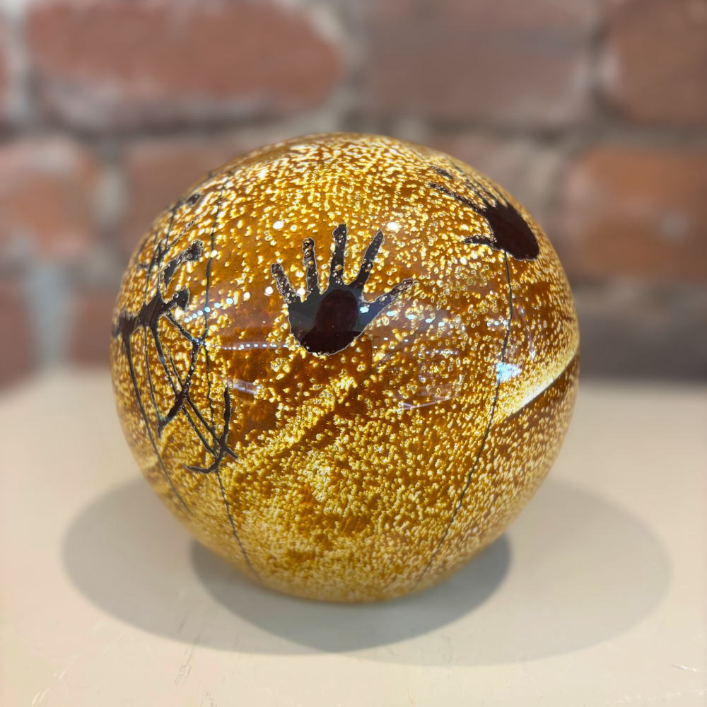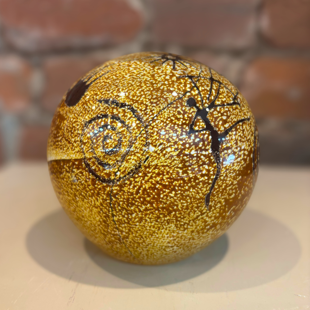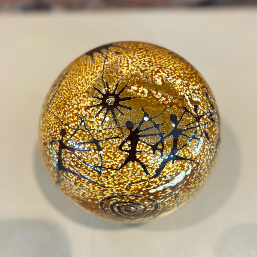 A striking hand-made art glass paperweight by local artist Satava, featuring warm golden tones with petroglyph-style warrior figures and spiral detailing. A bold collectible piece with beautiful depth and shimmer.