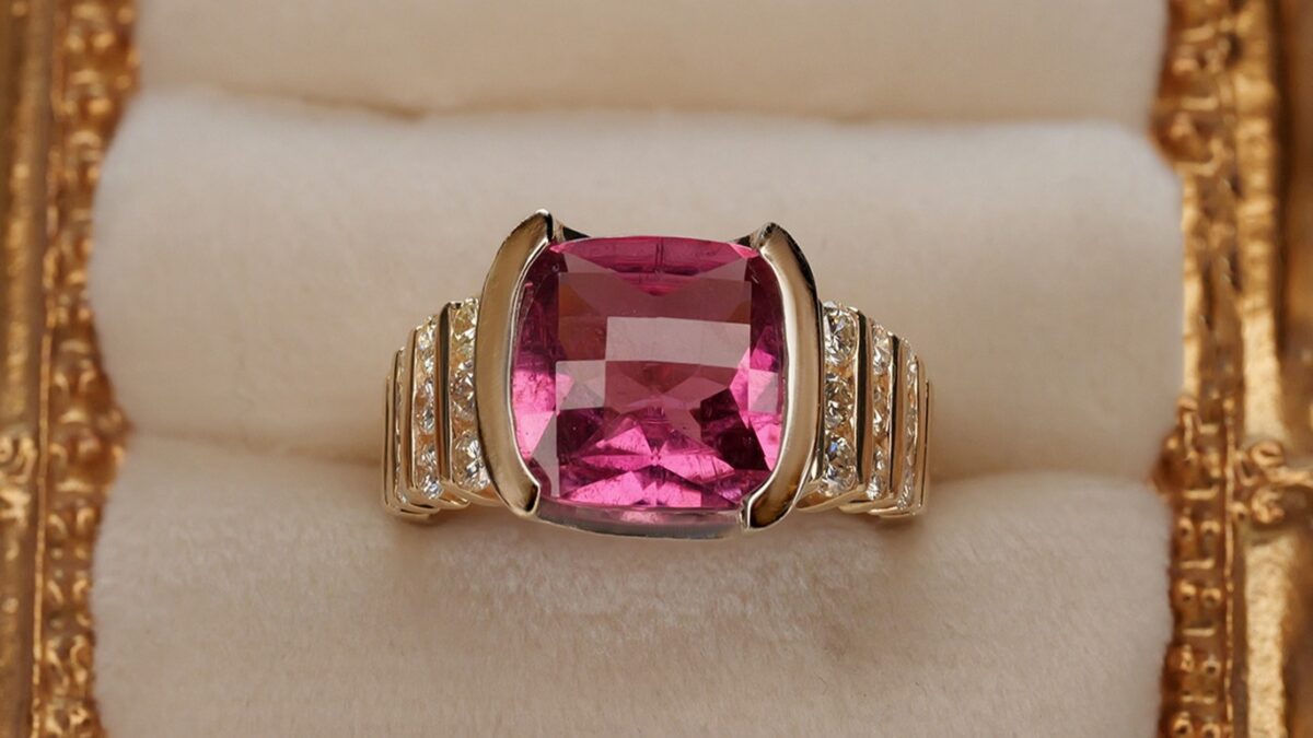 A beautiful balance of color and sparkle. This ring features a vivid cushion-cut pink tourmaline set in white gold, paired with a warm yellow gold band and delicate diamond accents for a refined, timeless finish. Bold yet elegant, it’s a standout piece designed to be treasured.