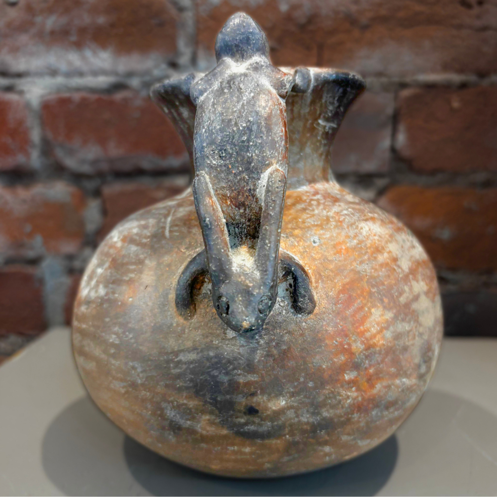 A compelling Pre-Columbian effigy vessel crafted from terracotta, featuring an animal form—possibly a rabbit or similar creature—clinging to the side of the vessel. Effigy pottery like this held cultural and ceremonial significance, often symbolizing spiritual beliefs, animals of power, or connections between the natural and sacred worlds in ancient societies.