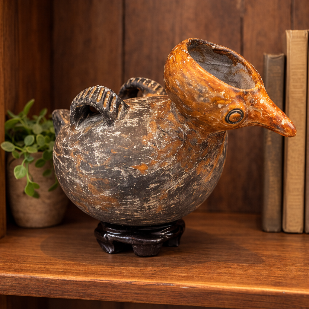 A remarkable duck-shaped whistling vessel attributed to the Vicus culture of ancient Peru. Designed with dual chambers, this effigy produces a distinctive whistling sound when liquid is poured or air is blown through the spout—often mimicking bird calls or other natural sounds. Such vessels were believed to hold spiritual significance, serving as a bridge between the physical and spiritual worlds during rituals and ceremonies.