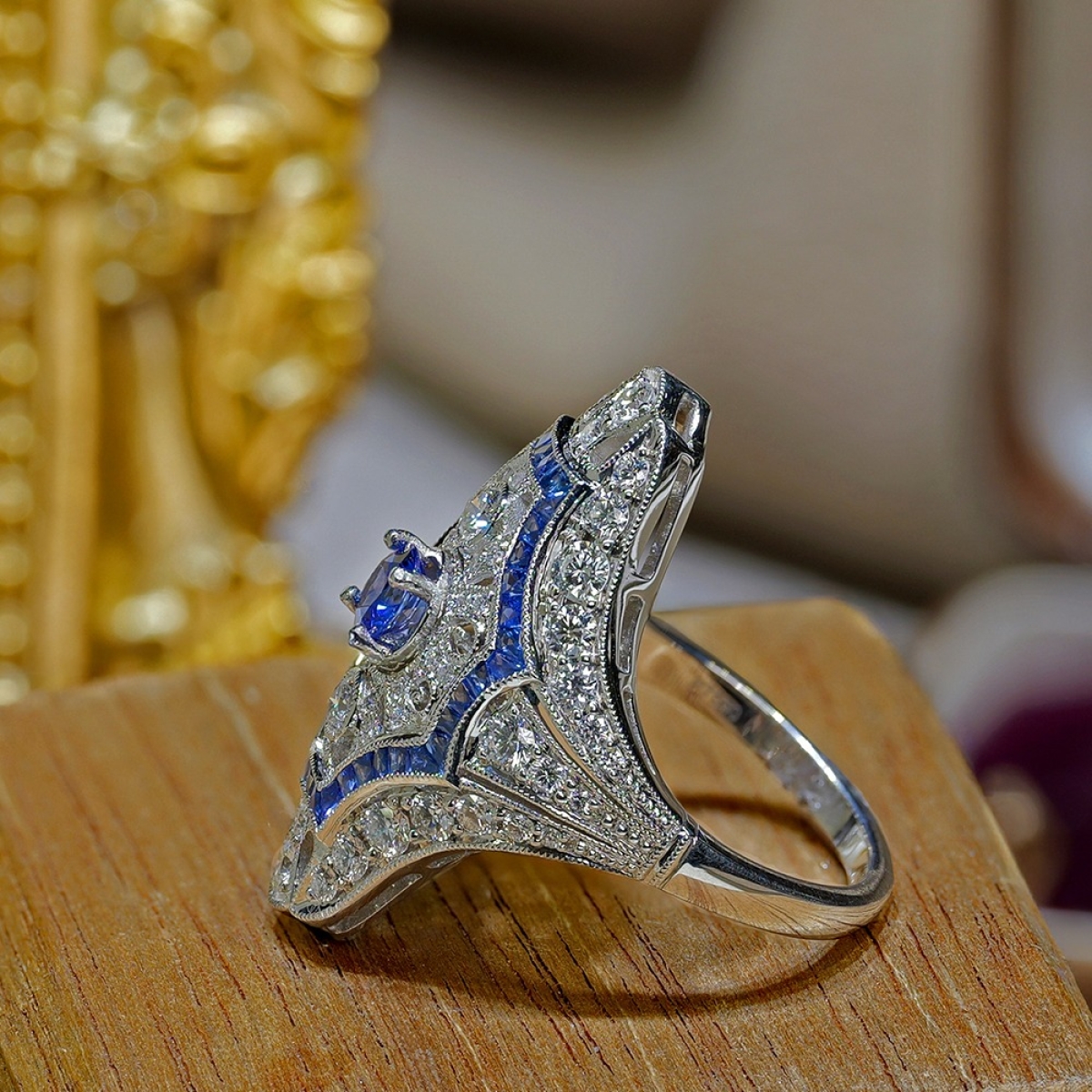 A refined platinum ring designed with sparkling diamonds and sapphires.