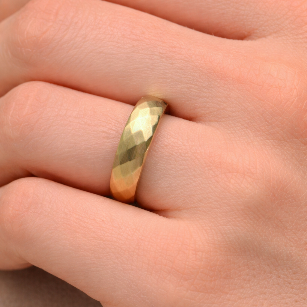 A clean and contemporary estate band crafted in 14K yellow gold, featuring a faceted design with a soft satin finish. The subtle texture catches the light beautifully, giving this classic band a modern edge while remaining timeless in style.