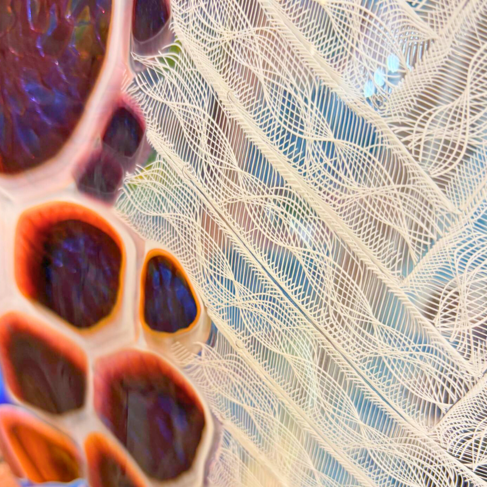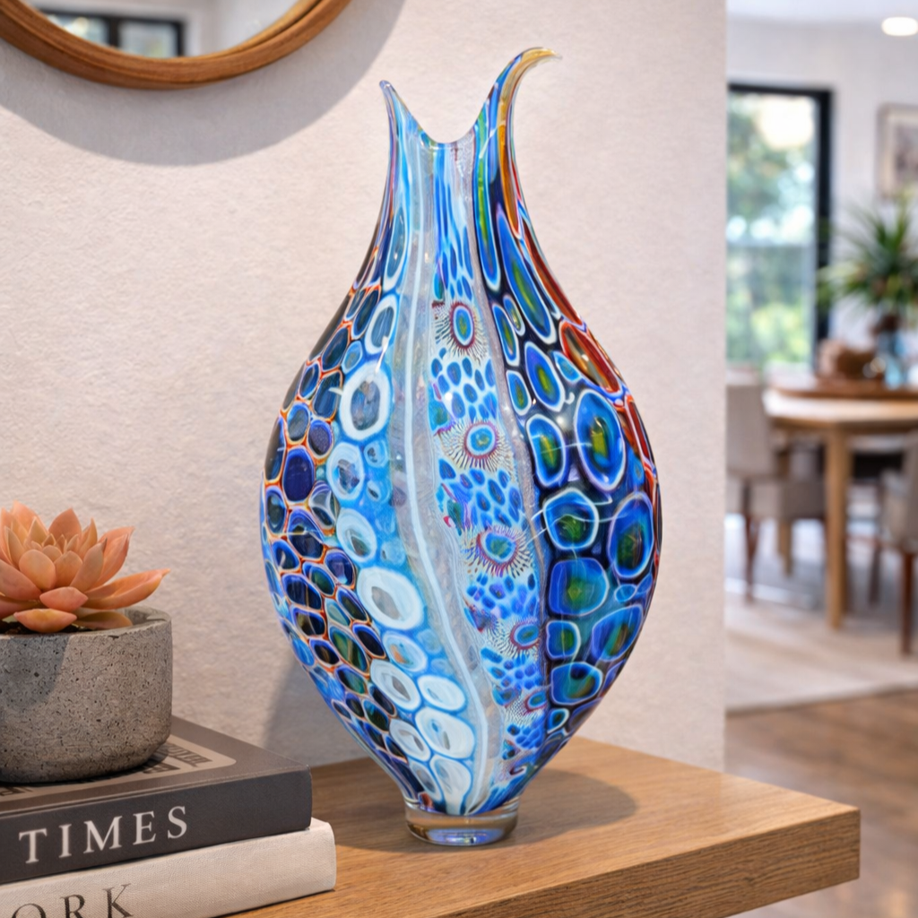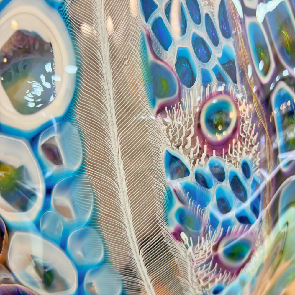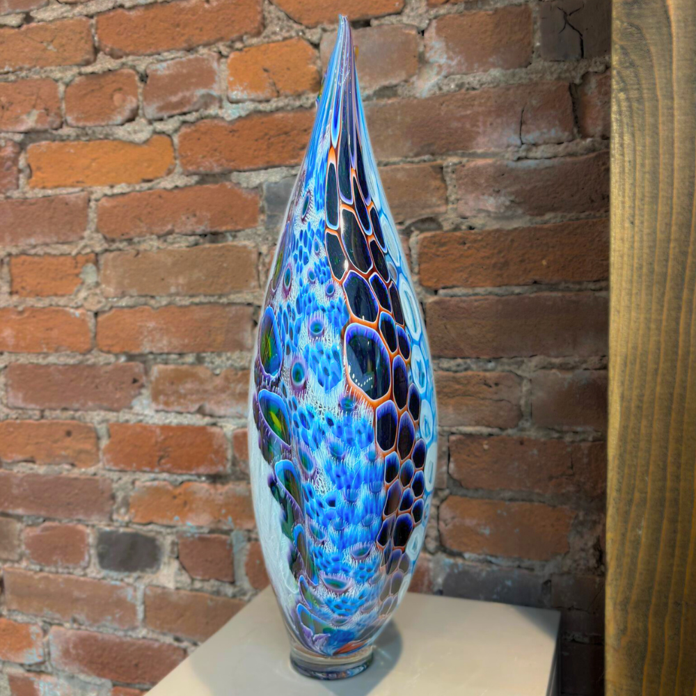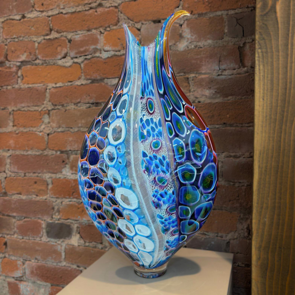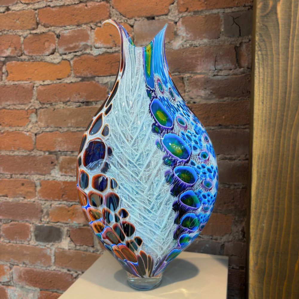A beautifully sculpted hand-blown art glass piece by Sutherland Glass, featuring a flowing fish tail form with speckled feather-like detailing. The graceful movement and layered color create a striking coastal-inspired display.