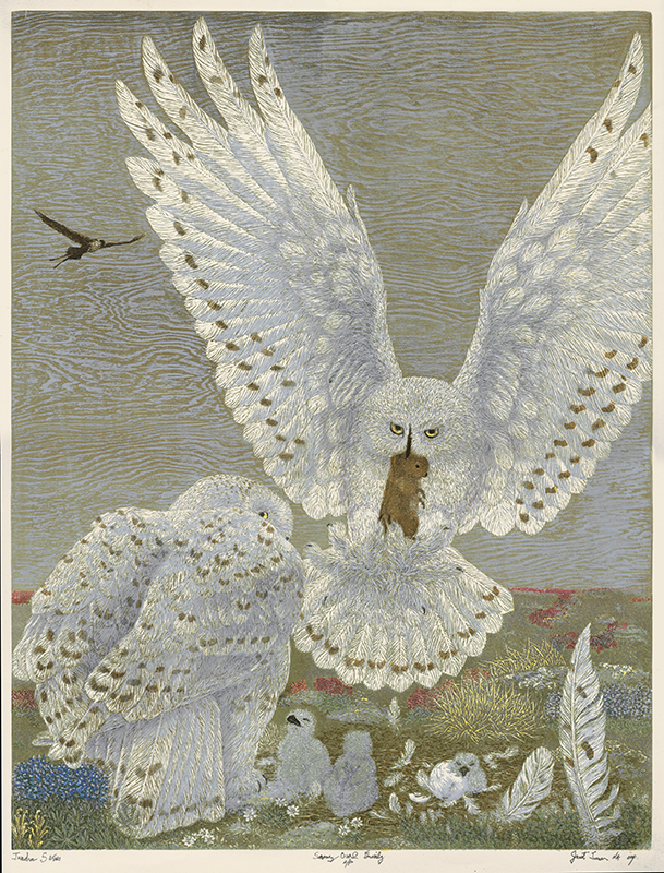 A serene yet powerful depiction of snowy owls merging into the stark Arctic landscape. Turner’s restrained palette and precise detailing highlight both the beauty and severity of tundra life, reflecting her mature, environmentally focused artistic voice.