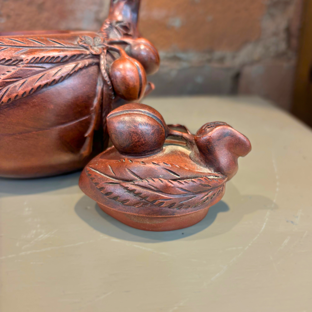 A beautifully crafted Yixing Zisha clay teapot formed in the shape of the auspicious “Immortal Peach,” a traditional symbol of longevity and prosperity in Chinese culture. The richly textured clay and sculptural detailing highlight the artistry of this distinctive piece.